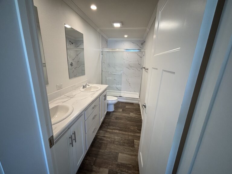 2 modern bathrooms featuring double sinks and a stand-up shower in the master suite