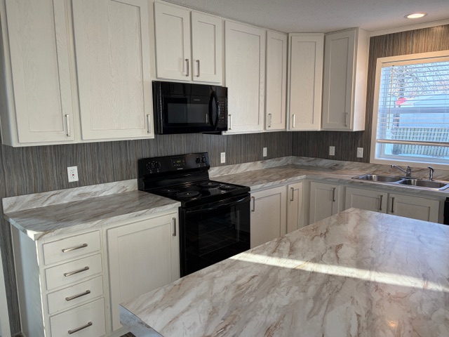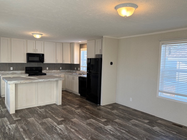Step into a bright, 2023 modern kitchen designed to impress — featuring a spacious center island, elegant wraparound cabinetry, and a dedicated pantry for added storage. Soft neutral tones, sleek black appliances, and rich vinyl flooring tie the space together, creating a refined yet welcoming atmosphere perfect for everyday living and entertaining.