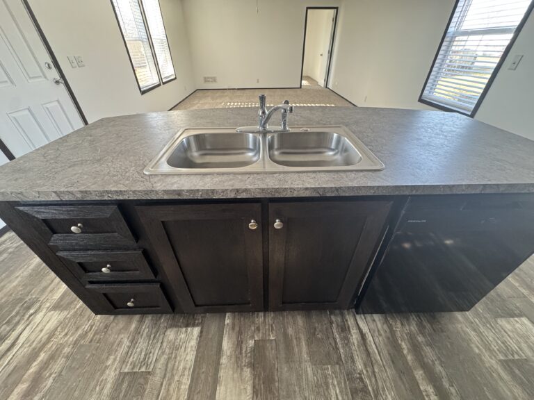 Large center island with a deep, double-basin sink and room for seating