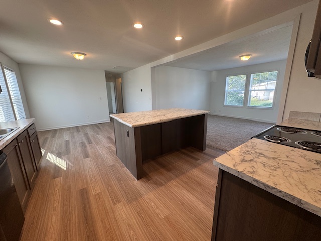 Welcome to this beautiful four-bedroom home featuring a bright, open-concept design perfect for family living and entertaining. The modern kitchen is the heart of the home, complete with a large center island, stylish cabinetry, and sleek black appliances. The open layout flows seamlessly into the dining and living areas, creating an inviting space for gatherings.